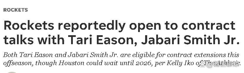 根據《The Athletic》記者Kelly Iko報道,休士頓火箭計畫在2025年夏天與2022年選秀的鋒線雙星塔里·伊森和小賈巴里·史密斯展開提前續約談判。兩人目前的合約都剩餘一年,火箭方面希望在烏度卡體系中長期留下這兩位重要球員。然而,火箭也不排除將他們作為交易籌碼,以引進超級巨星的可能性,因此兩人的續約前景仍充滿不確定性。