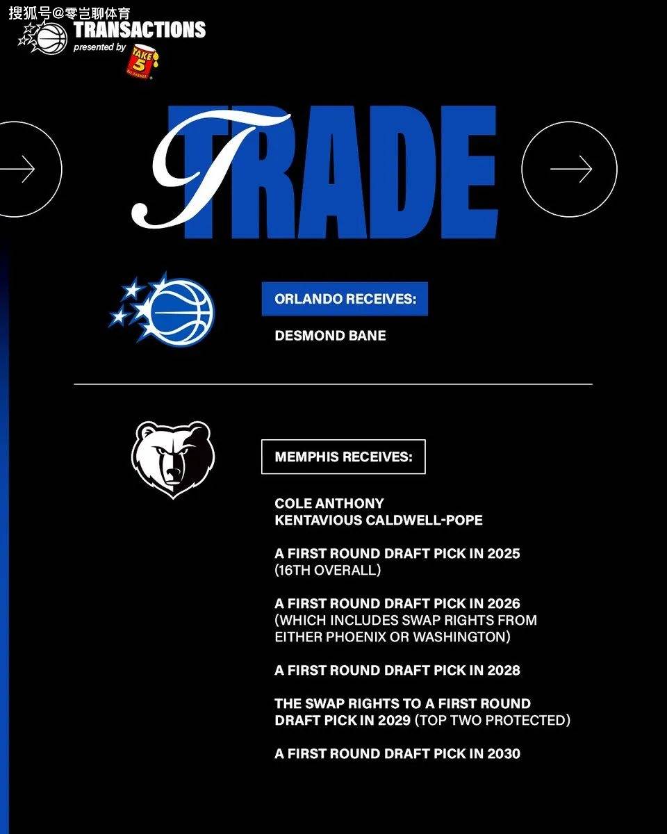 孟菲斯灰熊獲得:波普、科爾安東尼、2025年第16順位選秀權、2026年菲尼克斯太陽首輪選秀權、2028年奧蘭多魔術首輪選秀權,2030年奧蘭多魔術首輪選秀權、2029年奧蘭多魔術首輪選秀權互換