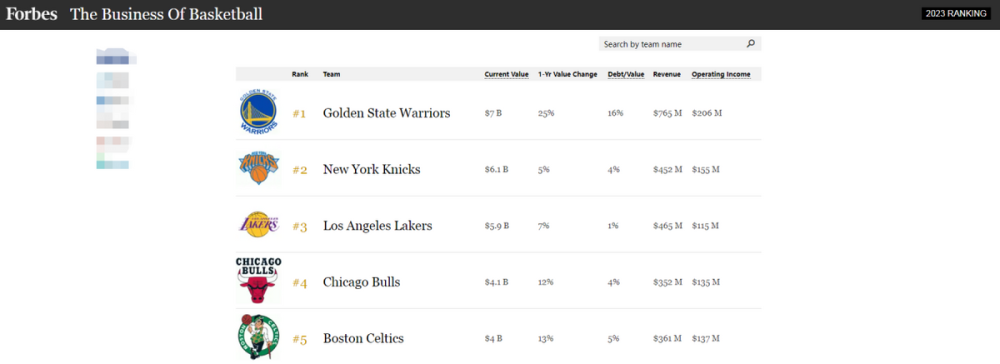 根據《福布斯》公佈的數據,自2022年以來,勇士在全球最有價值運動隊排名里提升了5名,2023年70億美元的市值高居NBA第一。