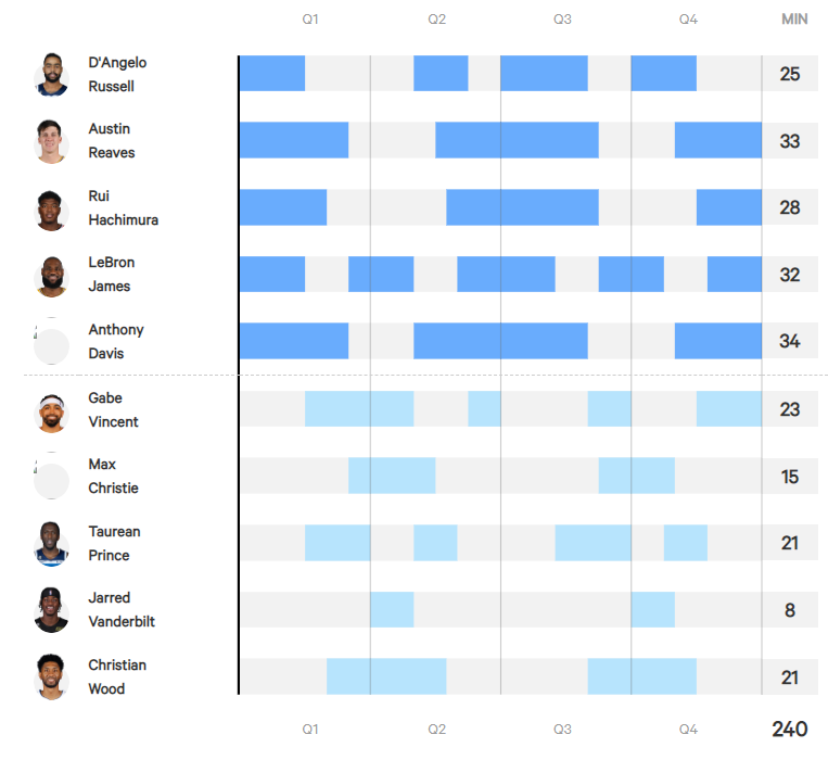 首發:拉塞爾(25分鐘)、里夫斯(33分鐘)、八村壘(28分鐘)、詹姆斯(32分鐘,預計生涯新低)、戴維斯(34分鐘)