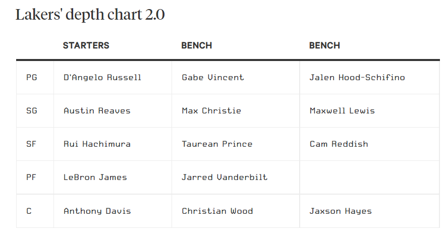 普林斯能打三號位,如果湖人需要更多投射和進攻時,他也可以去四號位。雷迪什很難獲得穩定的出場時間。