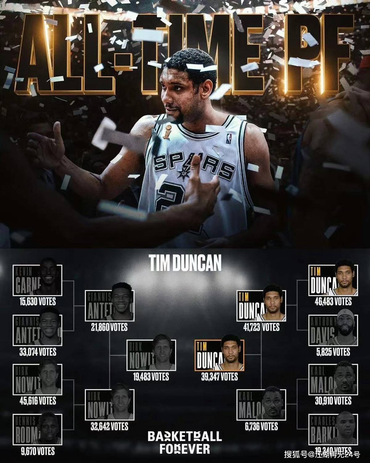 相比於其他超級巨星,鄧肯的打法和性格都要低調得多,這就導致很多球迷在討論歷史地位的時候總是會忽略鄧肯。實際上鄧肯職業生涯取得的成就不遜色很多歷史前十級別的巨星,而且出道即巔峰的他,生涯第二個賽季就帶隊拿到了總冠軍,而他個人也拿到了那一年FMVP。後來在鄧肯的帶領下,馬刺常年都是聯盟裡的頂級強隊,在他19年的職業生涯當中,總共幫助球隊奪得了5次總冠軍,而他有3次都是拿到了FMVP。