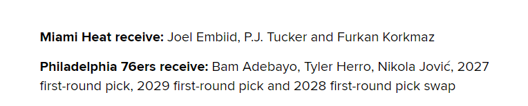 根據美媒《露天看台》的報導,一筆6換3的交易方案存在一定達成的可能性,熱火隊可以用阿德巴約、希羅、約維奇、2027年首輪選秀權、2029年首輪選秀和2028年首輪選秀互換權交易恩比德,以獲得PJ-塔克和科爾克馬茲。