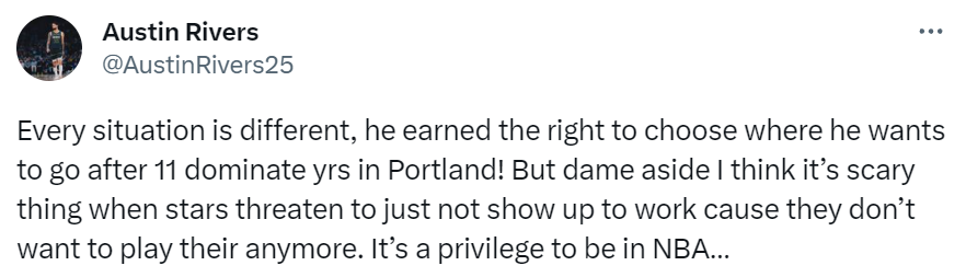 自由球員小里弗斯也談到利拉德。他寫道:“每個人的情況都是不一樣的。在波特蘭打出11個賽季的統治力後,利拉德為自己贏得了想去哪裡的權利。但撇開利拉德不談,我認為明星球員威脅不替球隊出戰是件可怕的事情,因為他們不想再為球隊打球了。能在NBA打球很榮幸。”
